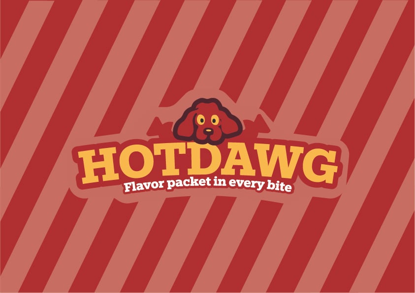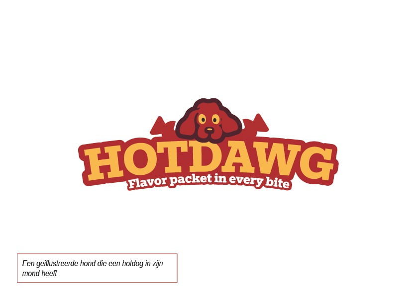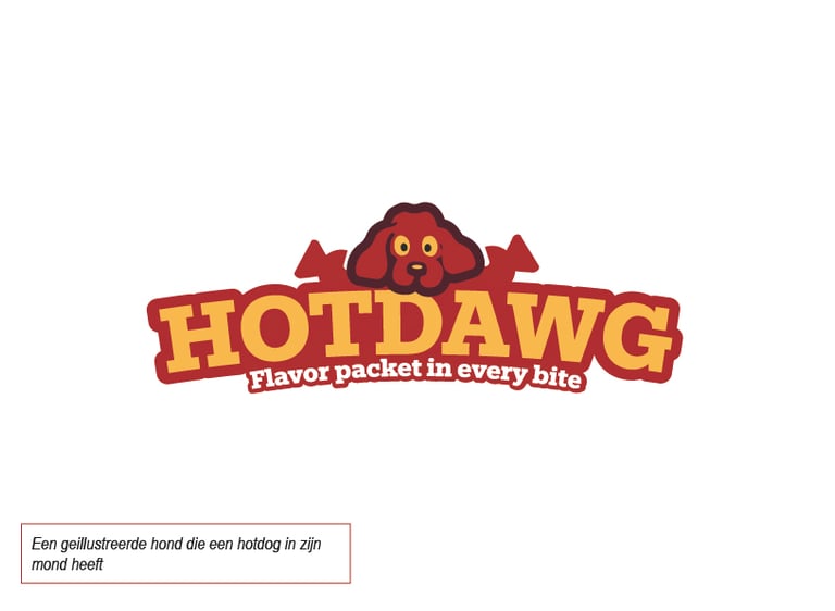 Een geïllustreerde hond die een hotdog in zijn mond heeft.