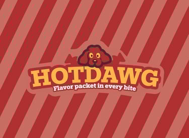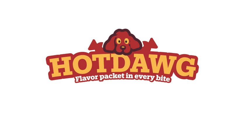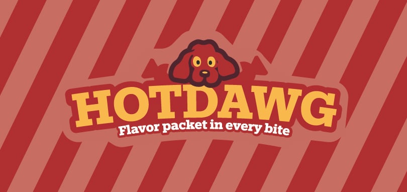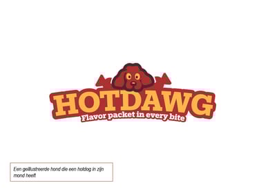 Een geïllustreerde hond die een hotdog in zijn mond heeft.